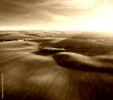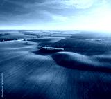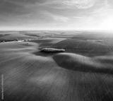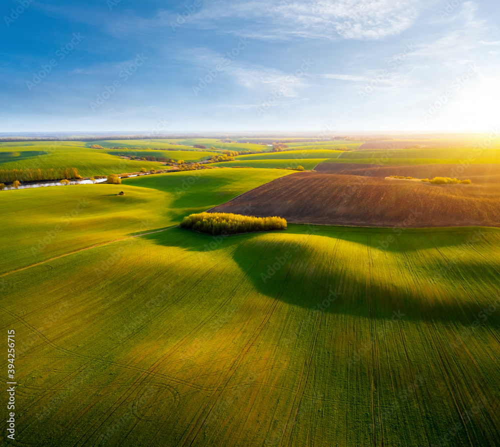 Aerial photography of green wavy field with shadows from sunlight in the evening.