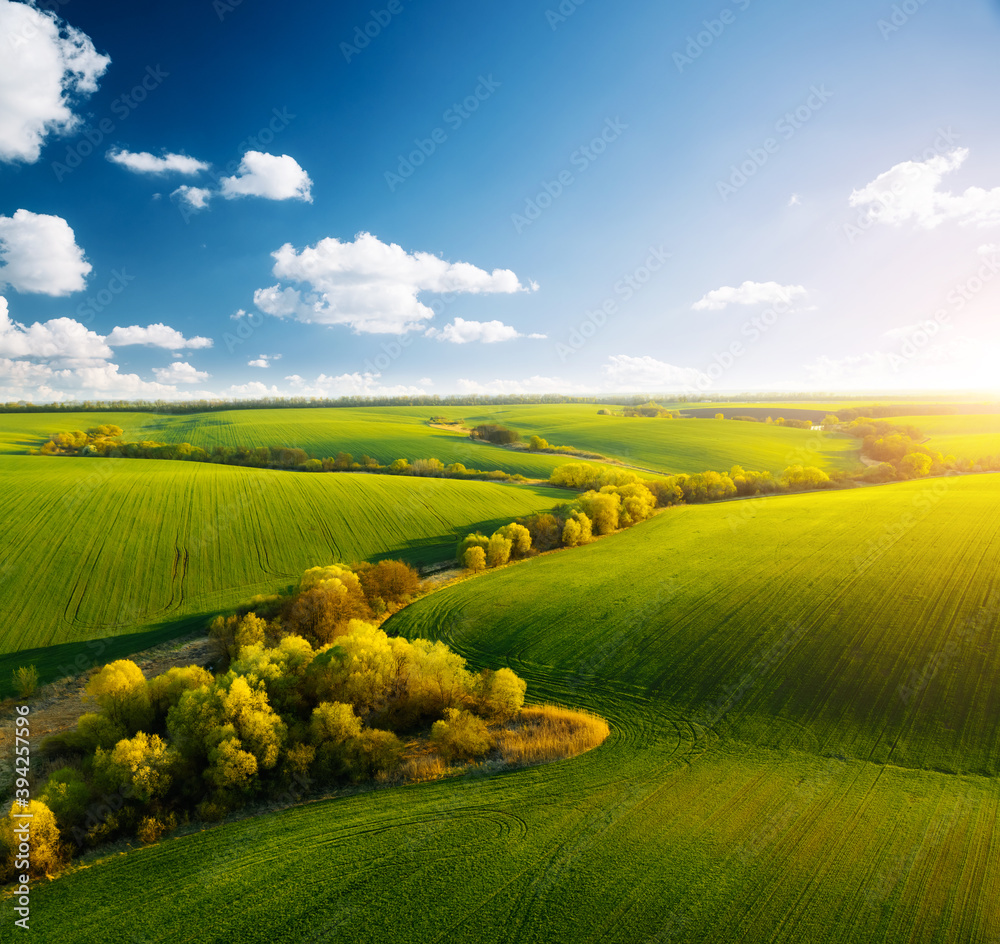 Fantastic aerial photography of green wavy field in sunny day. Top view drone shot.