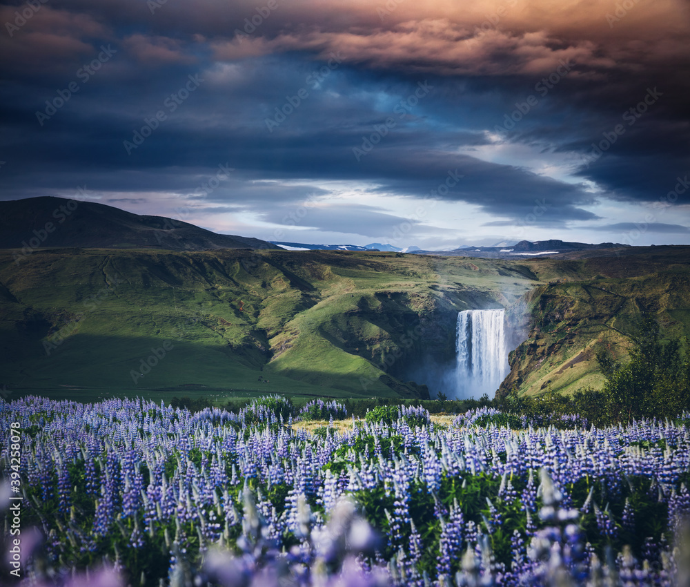 Beautiful summer view of exotic lupine flowers. Location place Skogafoss waterfall, Skoga, Iceland, Europe.