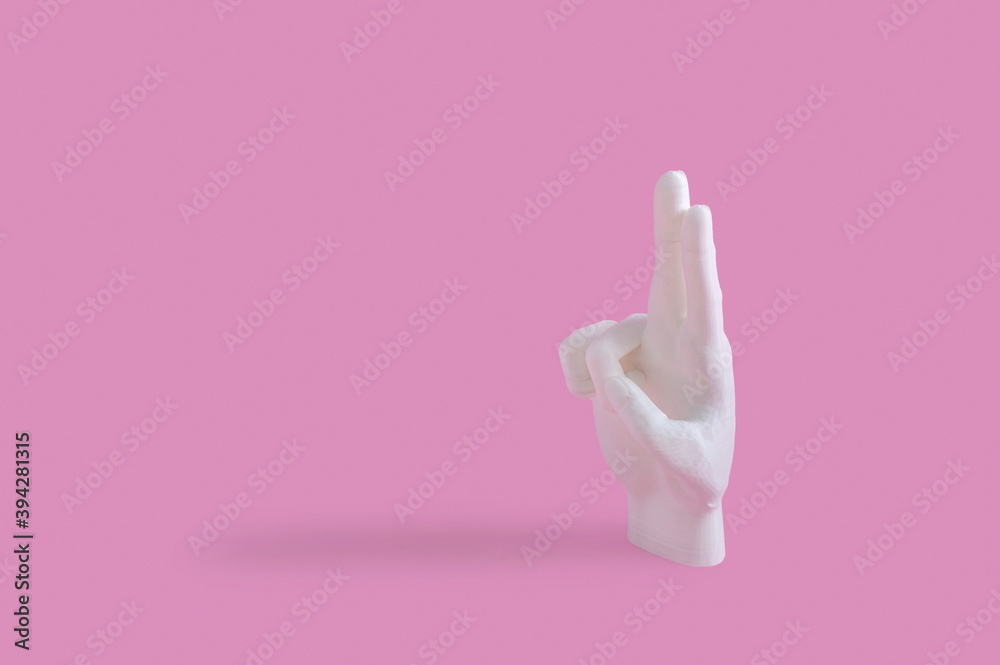 Creative concept with human hand showing two fingers up on pastel pink background. Flat lay design