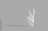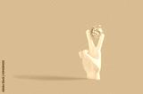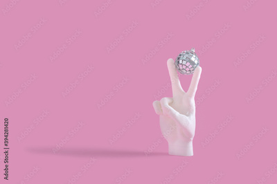 Creative New year concept with human hand holding disco ball Christmas tree decoration on pastel pink background. Flat lay design