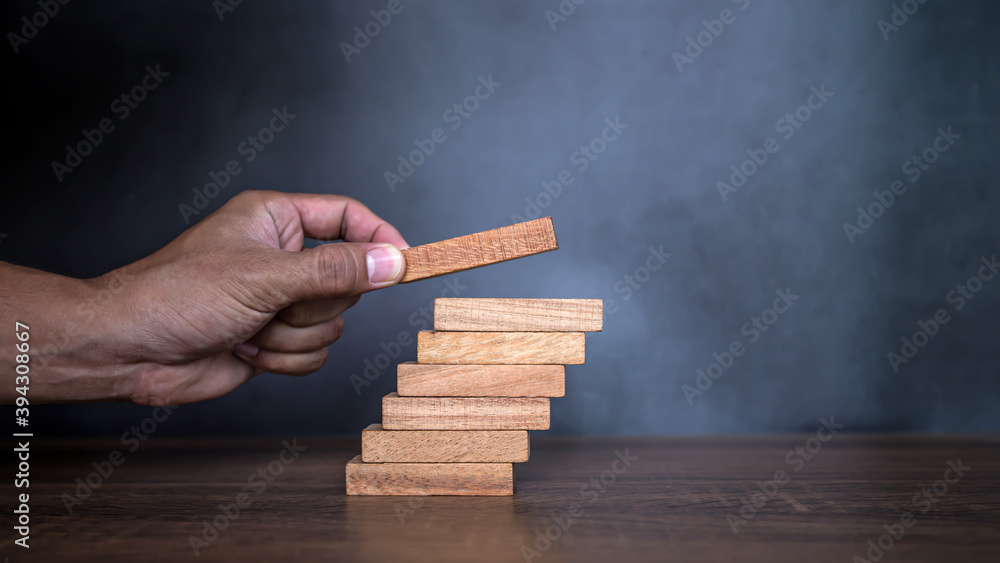 Close-up hand is placing wood block tower stacked in stair step with caution to prevent collapse or crash concepts of financial risk management and strategic planning.