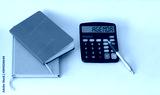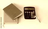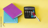 Calculator with agenda text on white background, plus colored notepads and stickers