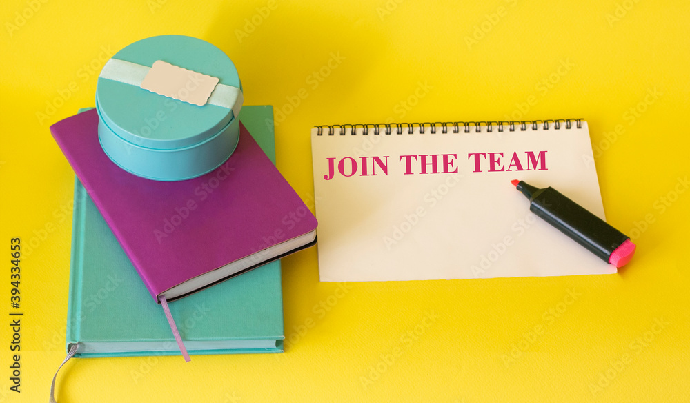 Notebook with tools and notes with text JOIN THE TEAM, business