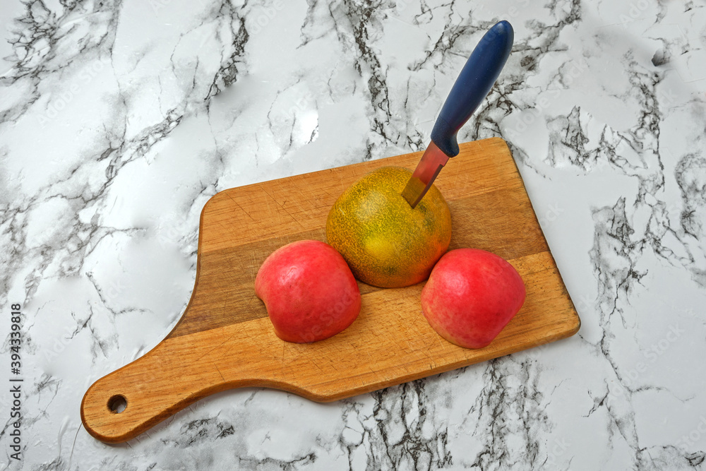 Half a melon and two halves of an Apple with a knife stuck on a cutting Board on a marble background close up