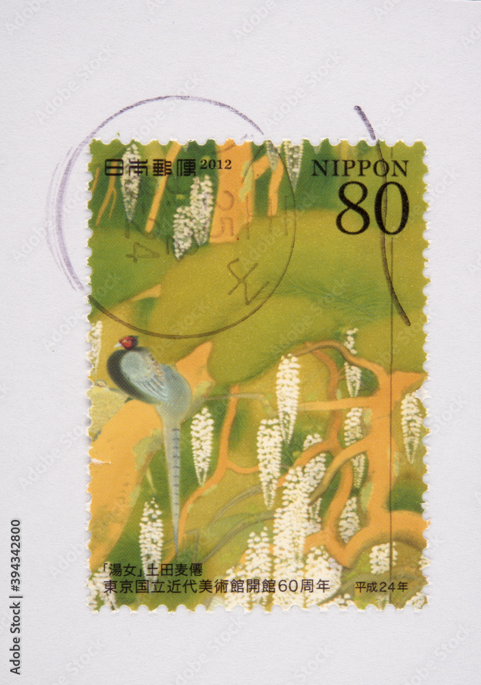 briefmarke stamp vintage retro alt old frankiert cancel gestempelt japan nippon vogel bird grün gelb Hachioji Yuna Tsuchika Bakusen flieder fasan weiss 80
