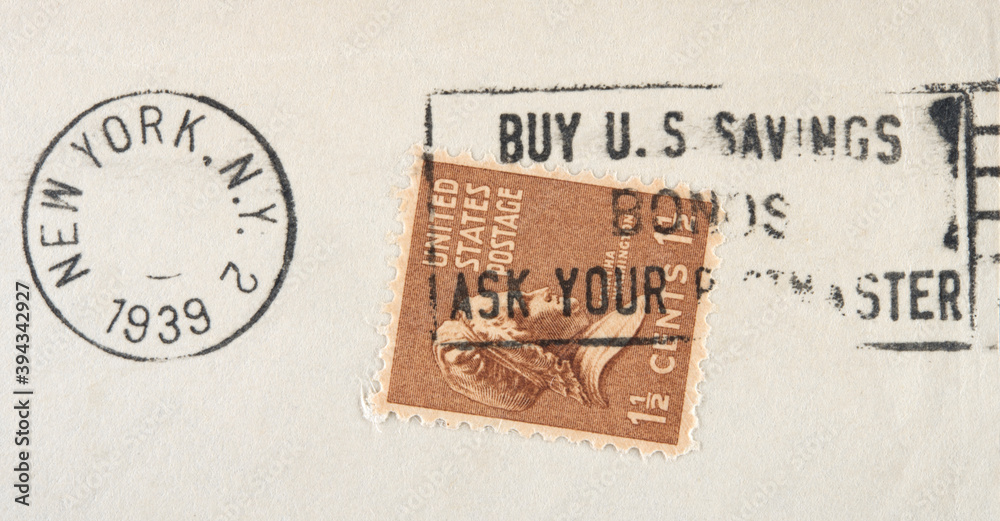 briefmarke stamp vintage retro alt old frankiert cancel slogan usa amerika america werbung new york 1939 buy saving bonds ask your postmaster Martha Washington frau woman