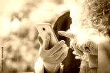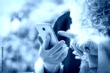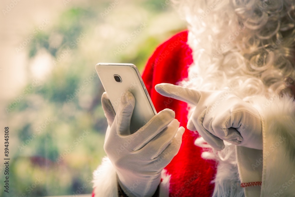 Santa Claus holding mobile phone ready for Christmas time on background. The season, winter, holiday, celebration, gift concept