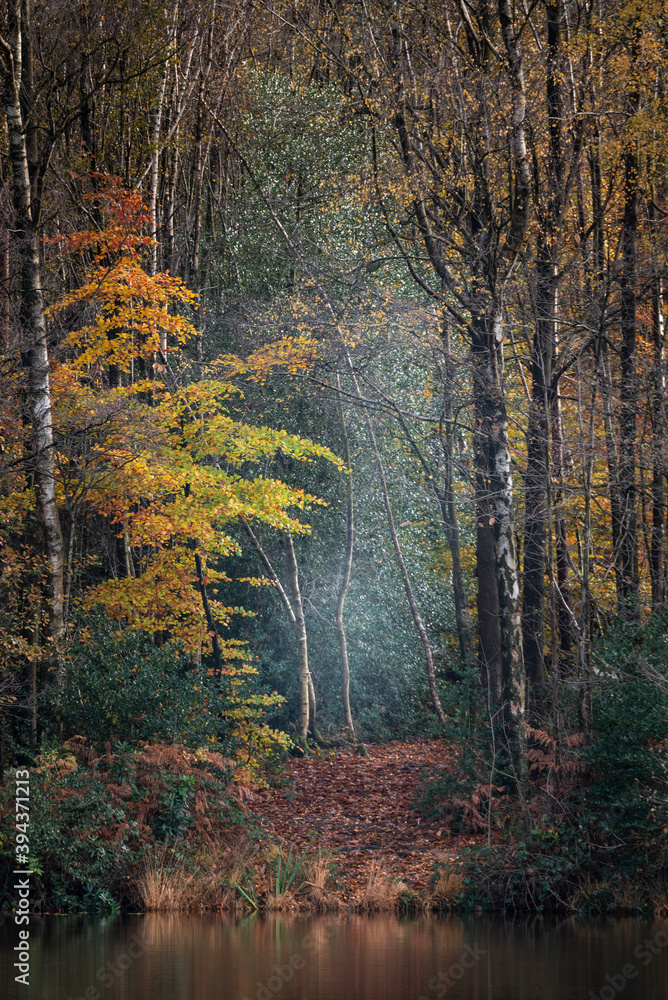 Beautiful vibrant Autumnal lakeside forest landscape image reflected in still water