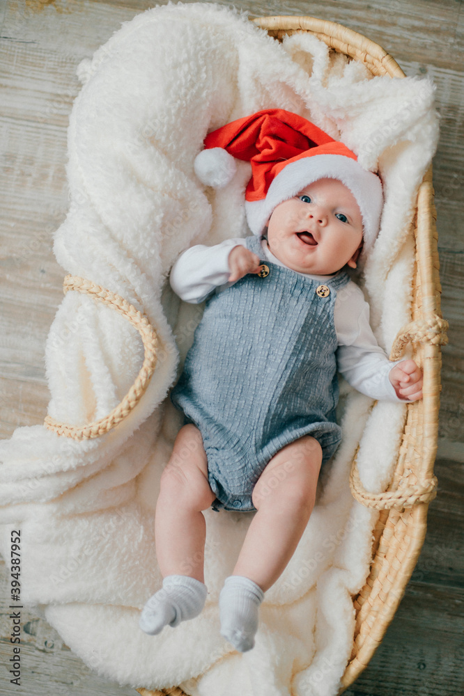 Picture of pretty newborn baby in Santa's Christmas cap and smiles