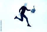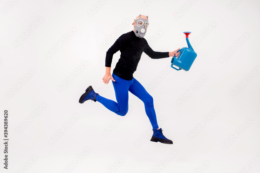 Funny strange man in respirator jumping over white background