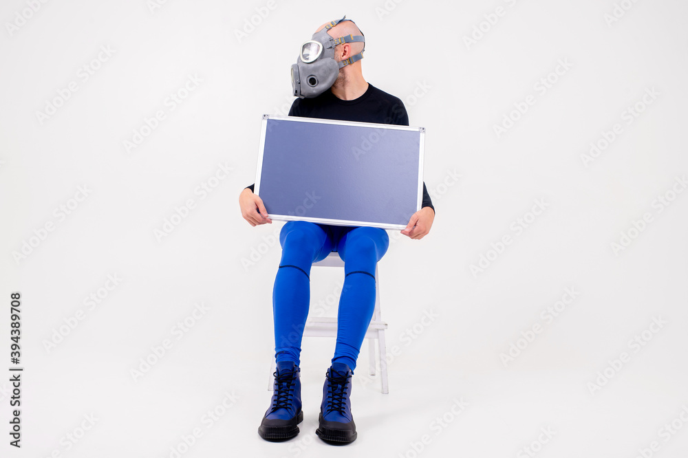 Funny strange man in respirator sitting on stepladder with a marker board over white background