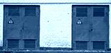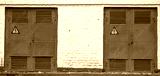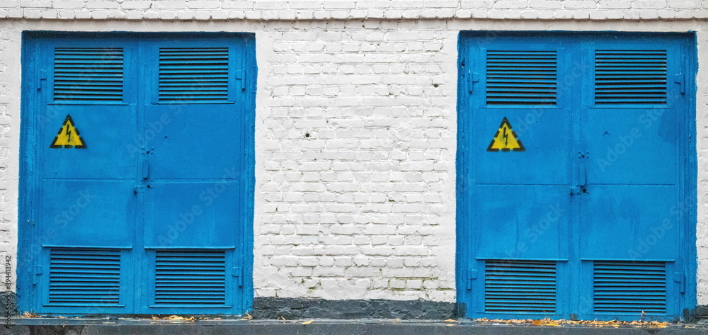 Twentieth-century brick wall with two doors to the danger zone-don't get in will kill
