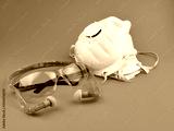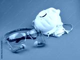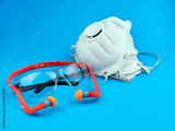 Personal protective equipment. PPE for workers. Dust masks, safety glasses and earplugs on a blue background