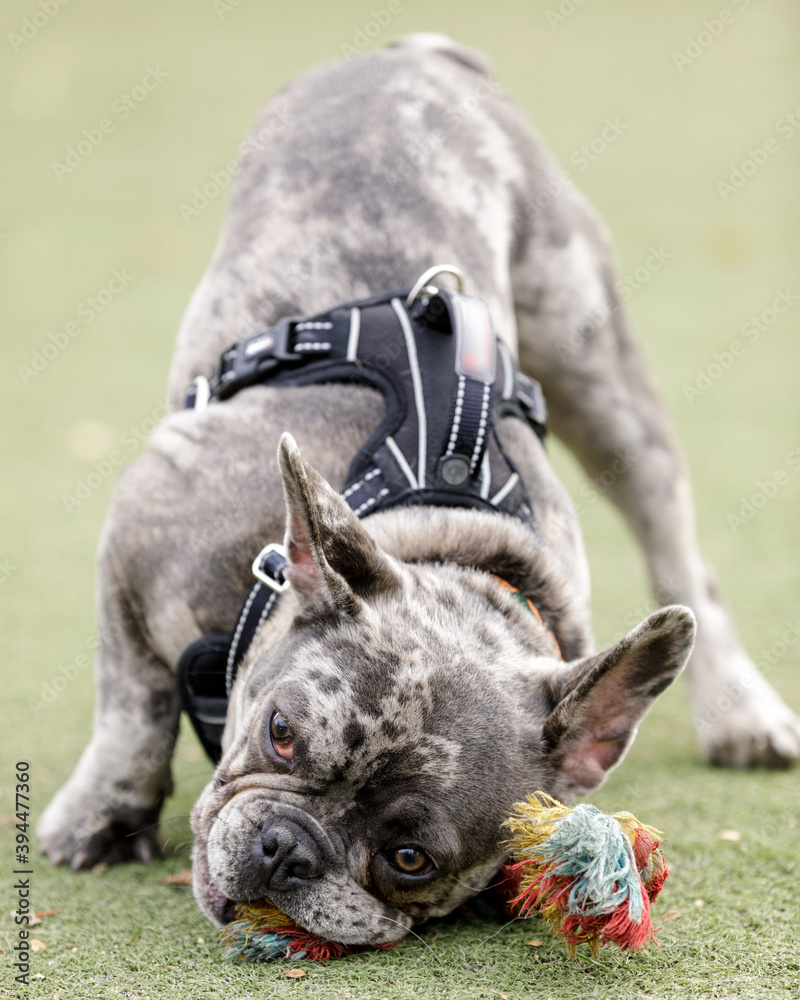 7-Month-Old Blue Merle Male Puppy French Bulldog Chewing Knot Rope Toy.