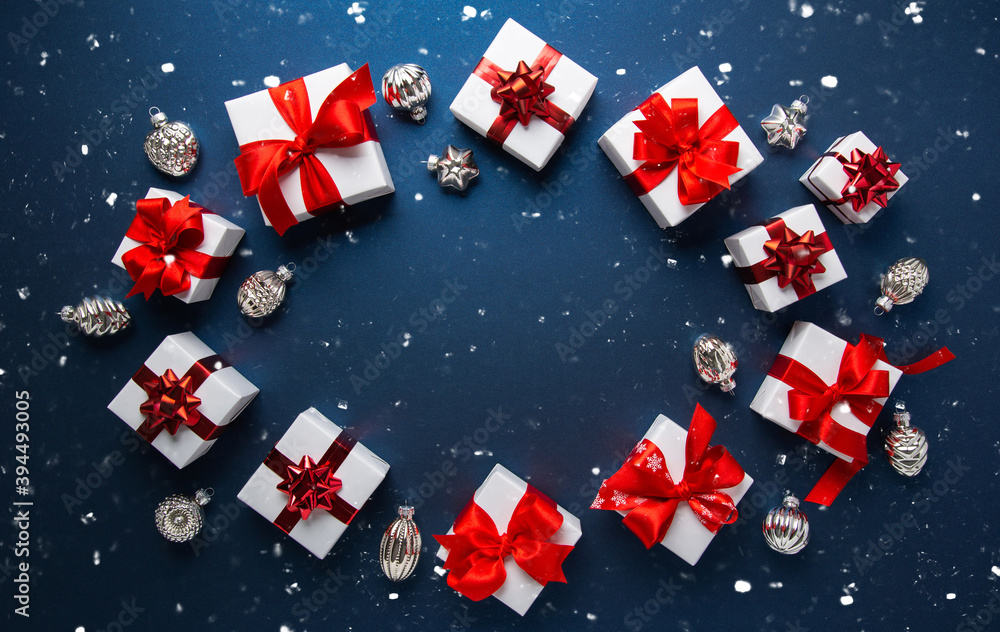 Merry Christmas and Happy Holidays greeting card, frame, banner. New Year. Noel. Christmas ornaments and gift box on blue background top view. Winter xmas holiday theme. Flat lay