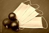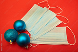 Face mask and festive decorations on the red New Year background. Corona virus Christmas background. Close up