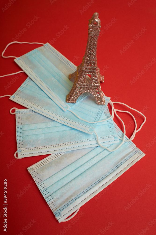 Face mask and Eiffel tower model on the red New Year background. Coronavirus Christmas background. Black and white photography, close up