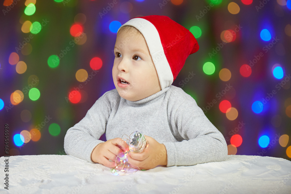 Cute little child in Santa Claus hat on the background of daisies