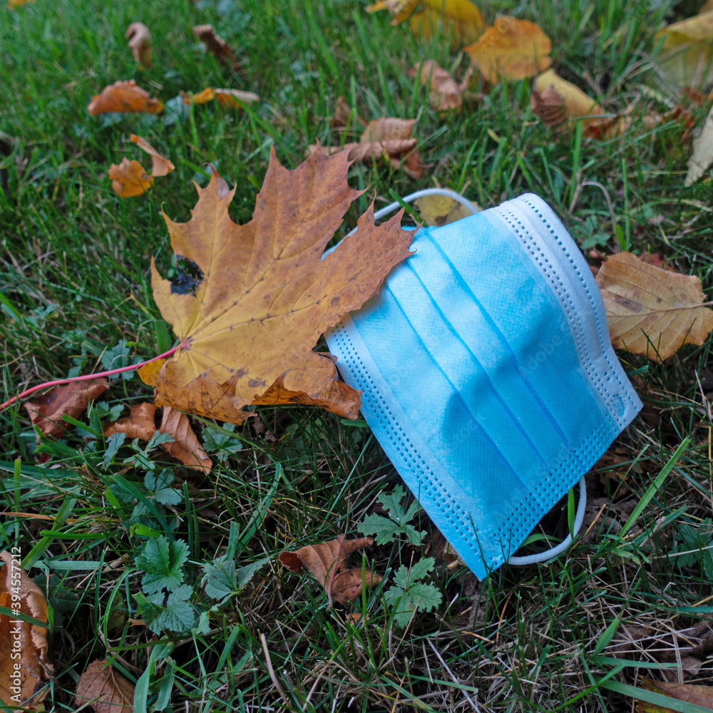 Mundschutzmaske im Herbstlaub auf der Wiese