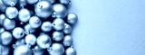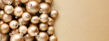 Christmas decorations, top view of pile of glass balls colored in champagne, isolated on beige background, useful as a greeting gift card template