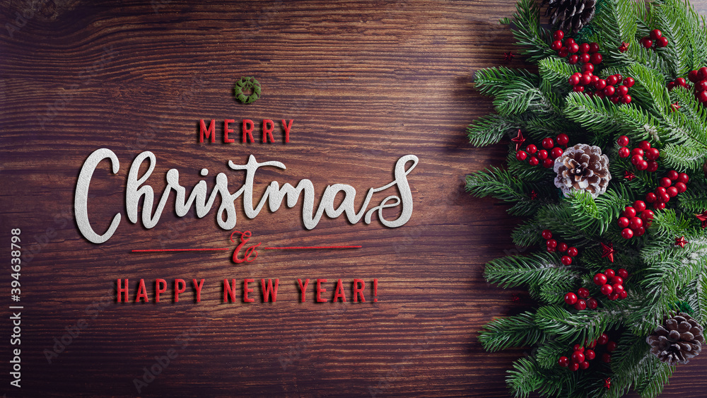 Christmas branches decoration concept with berries, stars and pine cones on old wooden background.