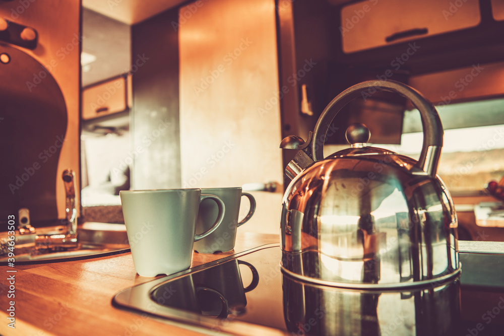 Kettle and Two Cups with Hot Tea Inside RV Camper Van