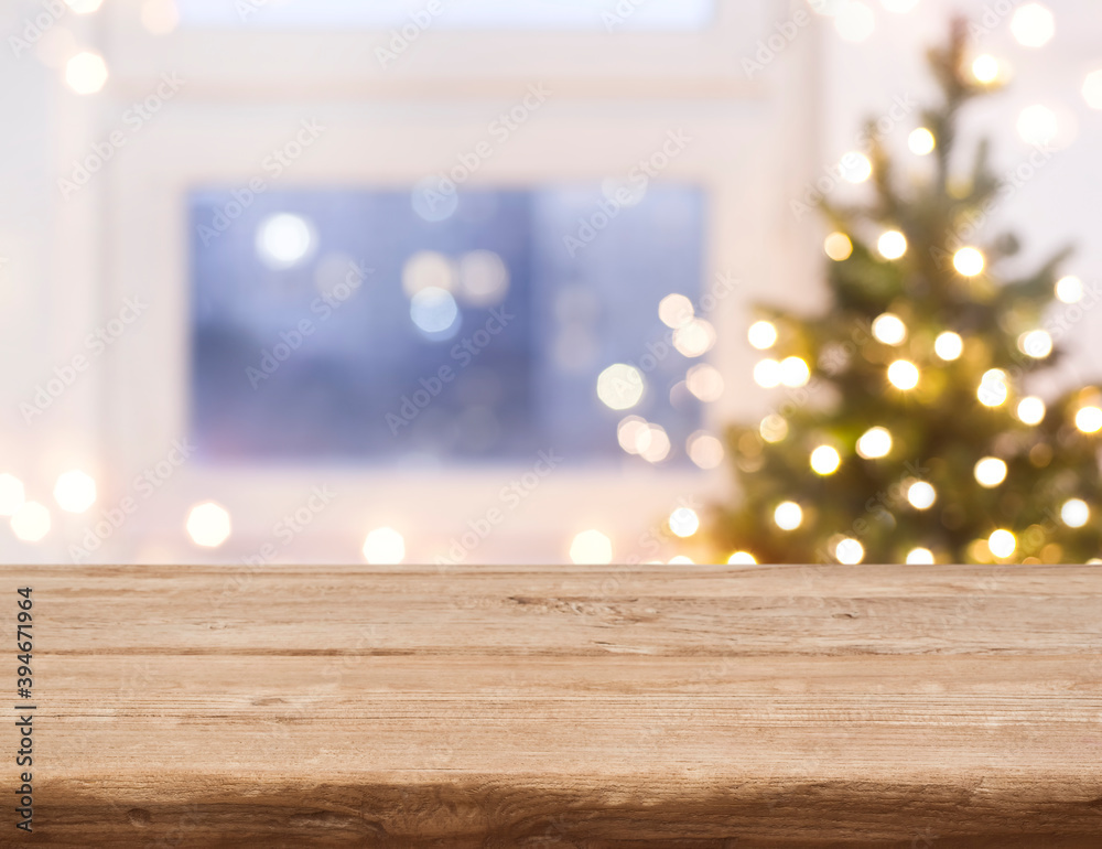 Desk space in front of defocused window with christmas tree