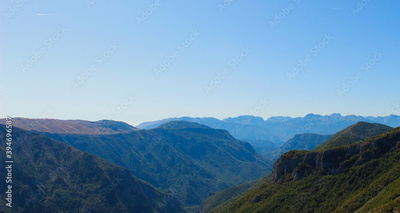 Banner of many mountain peaks and hills observed above the old Bosnian village of Lukomir. Mountain peaks and hills.
