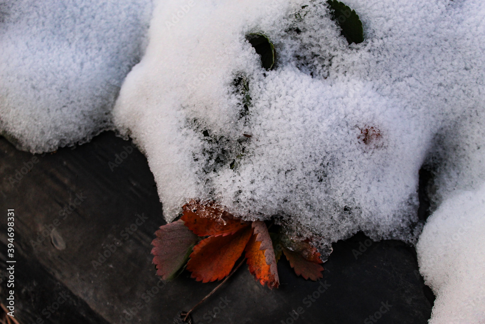 Dried strawberry leaves under the snow. Snow covered strawberries that are grown on black plastic foil.