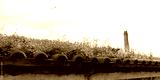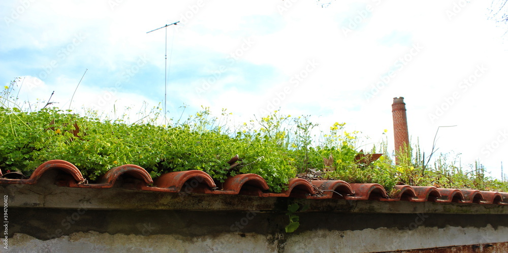 Banner of an old abandoned roof on which various plants grow and the sky in the background.