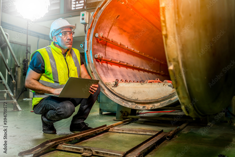 Chief Industrial Engineer in Hard Hats used Laptop Computer check and control machine while Sitting in the Heavy Industry Manufacturing Factory.man at work and maintenance engineer concept.