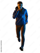 one young caucasian trail cross country runner running man silhouette shadow isolated on white background