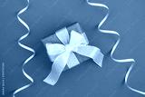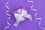 Top view of gift with silver bow on the violet background