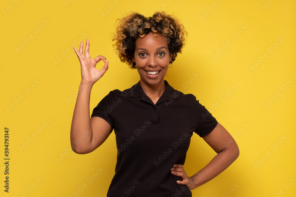 African american woman isolated on yellow background cheerful and confident showing ok gesture.
