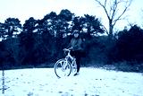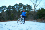 Extreme cyclist rides in the winter snowy forest. joyful riders in bright, modern outfit on light carbon mountain bike ride in the fresh pure snow in the woods snowy and wild in the city park