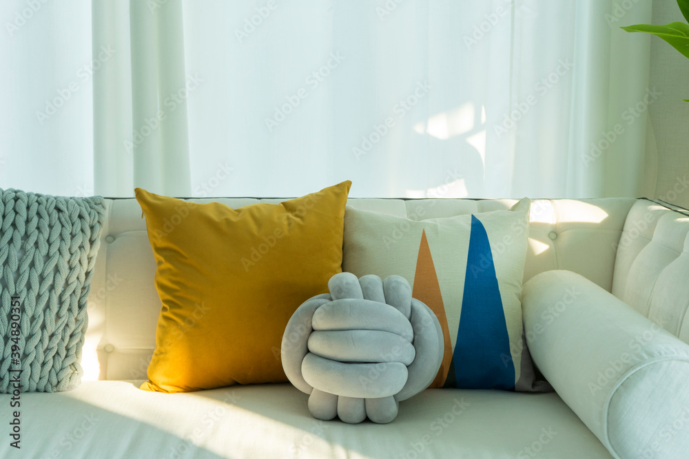 Beautiful modern living room interior with white sofa, colorful pillows, wood table and decorated vase with beautiful plant.
