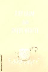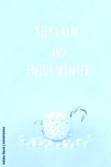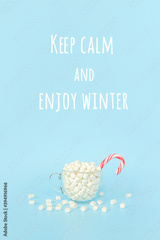Keep calm and Enjoy winter, motivational quote. Big transparent cup of marshmallows with red lollipop cane on blue background. Concept inspirational quote Front view, Greeting card