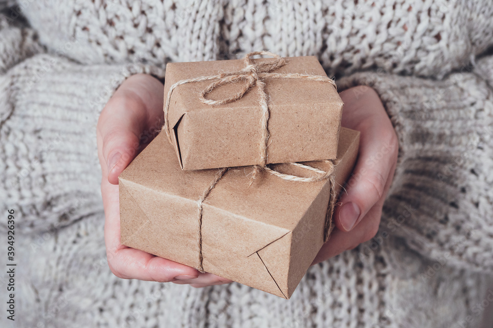 Gifts in women's hands, close-up. Monochrome, minimalist gift concept. A girl in a sweater holds gift boxes made of Kraft paper, tied with a string. Surprise background, greeting card