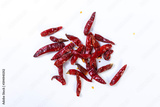 Dried red chili on white background, pile of red dried chilli pepper cayenne.