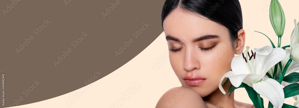 Beauty skin female face. Brunette woman with fresh skin and lily flower near her face, on set sail champagne color background. Cosmetology, beauty concept