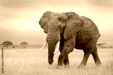 African elephant (Loxodonta africana) bull walking on savanna, looking at camera, Amboseli national park, Kenya.
