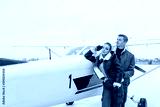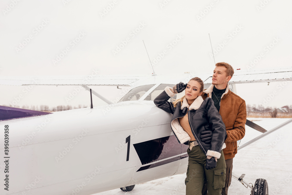 A beautiful, young, stylish couple in winter clothes on a snow-covered runway near a small pleasure plane.
