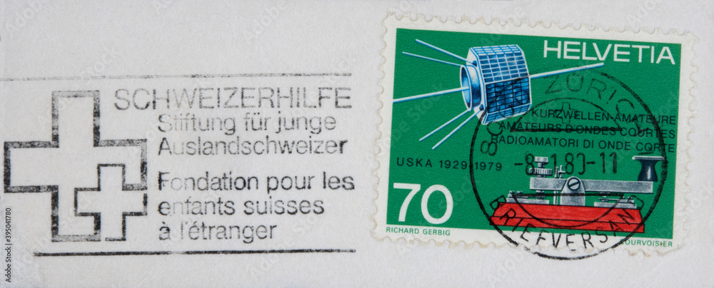 briefmarke stamp vintage retro alt old frankiert cancel gestempelt slogan schweiz helvetia swiss Schweizerhilfe stiftung für junge auslandschweizer funker kurzwellen amateure zürich