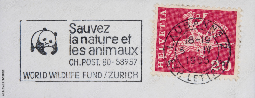 briefmarke stamp vintage retro alt old frankiert cancel gestempelt slogan werbung wwf zürich naturschutz sauvez la nature et les animaux panda bär bear helvetia schweiz swiss lausanne postbote pferd
