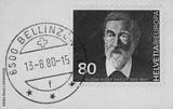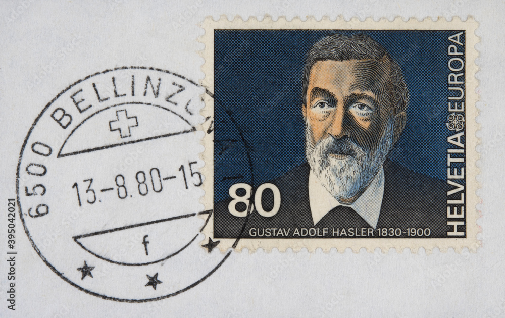 briefmarke stamp vintage retro alt old frankiert cancel gestempelt helvetia schweiz swiss kopf mann person 80 gustav adolf hasler bart beard hellinzona