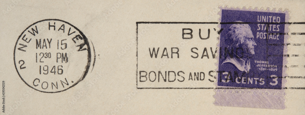 briefmarke stamp vintage retro alt old frankiert cancel gestempelt slogan werbung usa amerika america new haven 1946 lila purple thomas jefferson päsident president geischt profile man face gesicht