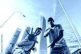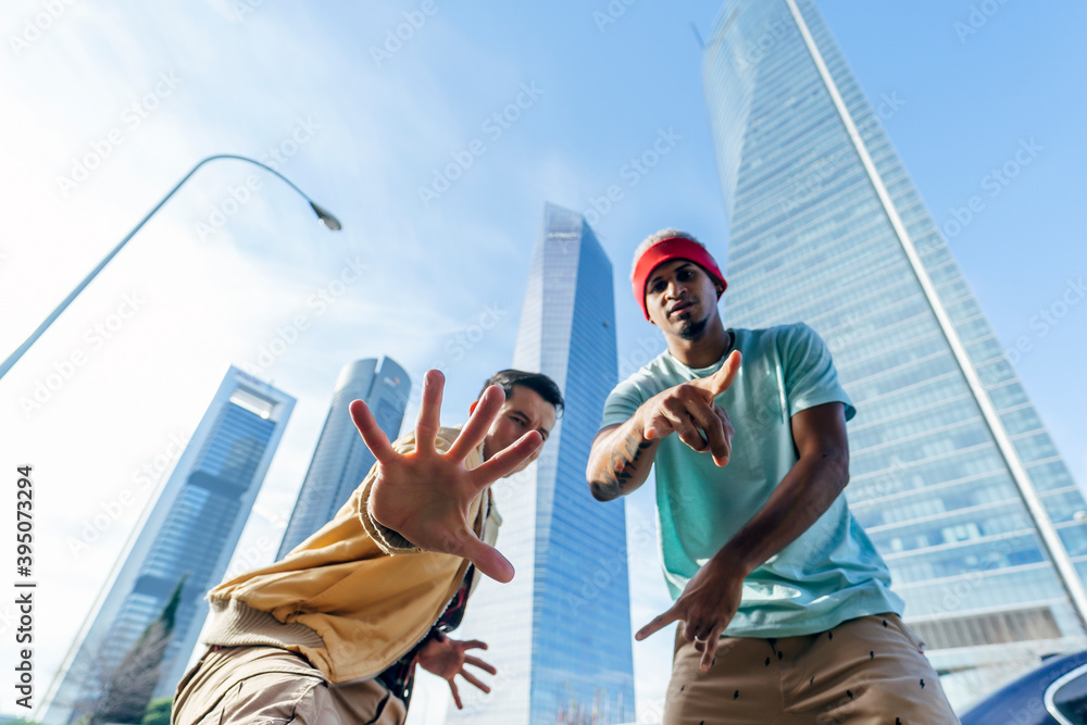 Close-up of two young men practicing break dance and posing to camera between skyscrapers