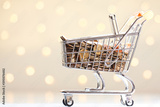 Miniature shopping cart filled with golden coins, color toned conceptual picture, selective focus.