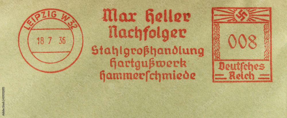 briefmarke stamp vintage retro alt old slogan werbung grün rot deutsches reich gestempelt used frankiert cancel rot red grün green 1936 hax heller nachfolger metall stahl